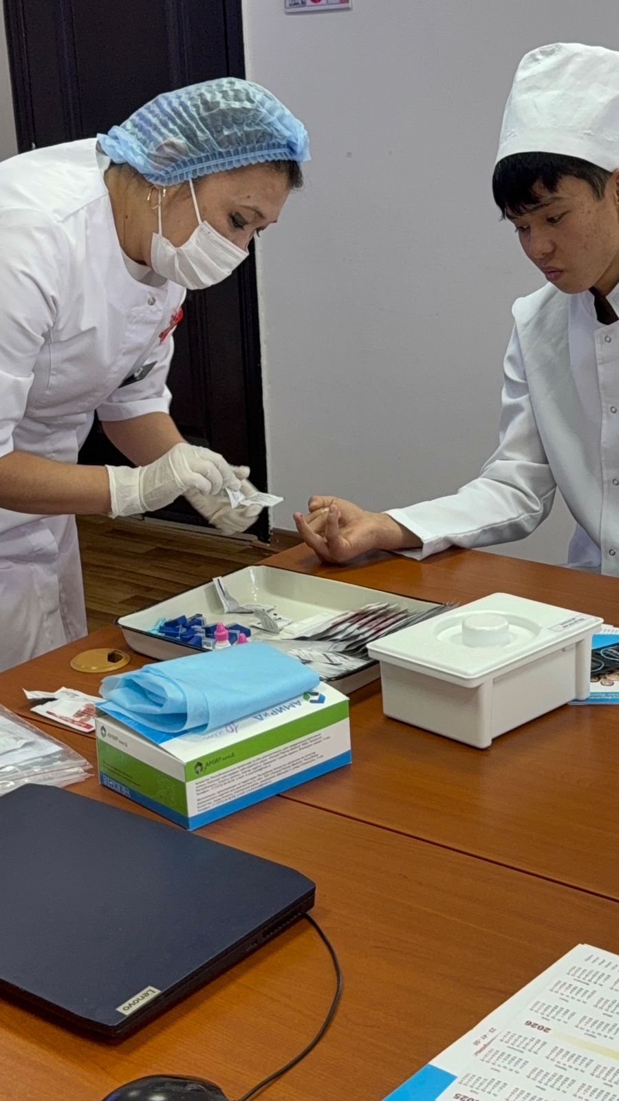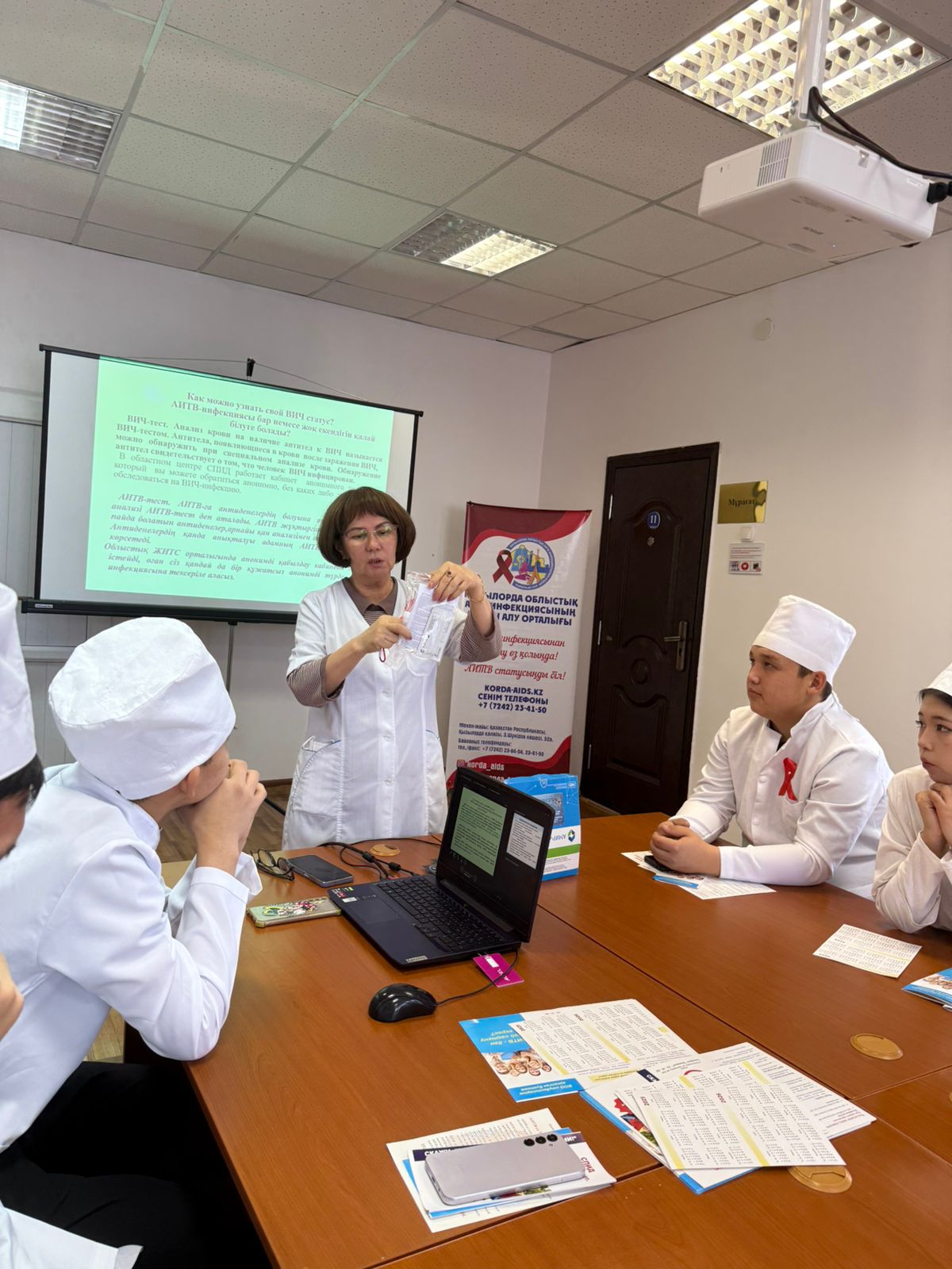 Сонымен қатар, қазіргі таңдағы АИТВ-инфекциясын ерте анықтайтын замануи жедел тестілер туралы мәліметтер беріліп, колледж студенттері арасында капиллярлық және сілекейлік тестілер қою бойынша практикалық сабақ өтікізілді.